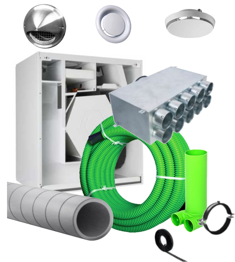 Die Materialmengen entsprechen einer nach DIN 1946 ausgelegten Lüftungsanlage für ein (Standard-)Einfamilienhaus mit 150 m² auf einer Etage und einer Nennluftmenge bis 200 m³/h. Der Aufstellungsort des Geräts befindet sich auf derselben Etage, innerhalb der thermischen Gebäudehülle. Die Anschlüsse der Außen- und Fortluft befinden sich in der Außenwand.